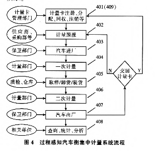 以上步驟描述了汽車物資采購進廠計量相關流程,對于廠礦內部物資倒轉等其他計量流程來說,步驟更為簡單。如廠礦內部物資倒轉只需大體按照步驟401、402、404、405、406、408、409執行,甚至可以采取期限皮重計量方式,即一天24小時內某車輛只過一次空車并將此次空車重量作為當天的皮重,這可以大大節約物流時間,降低物流成本。