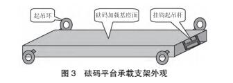 專用砝碼平臺承載支架自重約1.5 t,尺寸約為:長(2.6 m)x 寬(0.60 m)x 高(0.13 m),占地面積均為1.56 m2 (如圖3所示)。