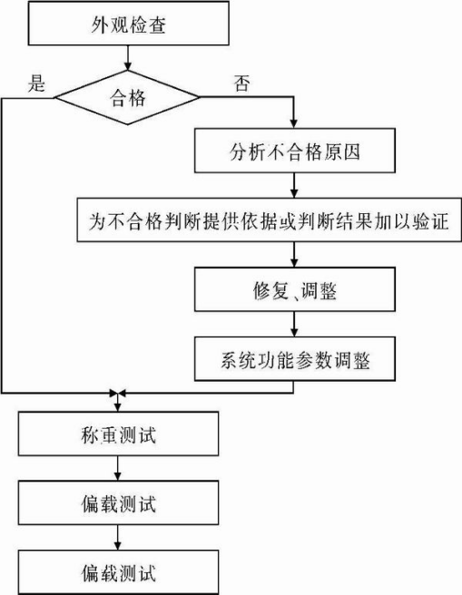 地磅經過一段時間的使用,出現偏差是正常的。引發汽車衡偏載超差的原因有多種,有時甚至幾個原因同時出現。在現場調試時,一般應遵循以下步驟,采用多種方法分析超差原因,利用角差公式詳細排查調試環節,偏差即可解決,附調試步驟圖(見圖3)。