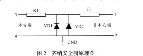 齊納安全柵基本電路如圖2所示,電路由快 速熔斷器F1,限壓元件VD1、VD2(齊納二極管)和 限流電阻三部分組成。正常操作條件下,非本安 端1、2之間所加的電壓低于最高壓Vmx(更低于齊 納二極管的齊納電壓),此時VD1、VD2處于不導 通狀態,除有極微小的漏電流以外,是“開路” 狀態,安全柵電路等效于一個電阻串聯在信號回 路內,只要漏電流小于規定值,安全柵電路就不 會影響系統的正常工作。