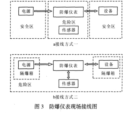 在實際應用中,一定要選擇參數能滿足現場 環境的防爆儀表,可以將上述參數針對現場要求 一一對比,看是否能滿足實際環境要求,同時, 需要根據系統其他組件的情況和實際安裝現場的 條件來設計整個防爆稱重系統。在防爆現場,我 們一般選擇符合要求的防爆型傳感器,但是其他 設備有時候不是必須防爆的,下面根據場合的不 同,有兩種接線方法,如圖3所示。