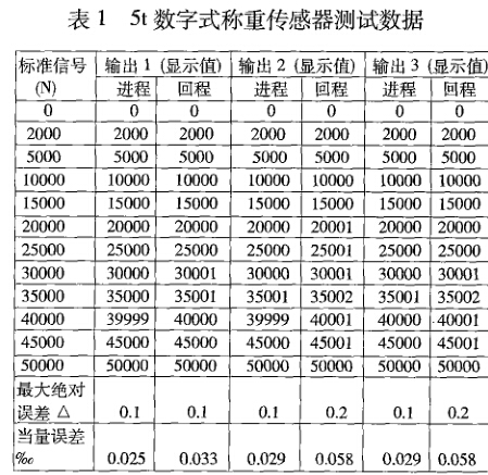 為了檢驗(yàn)數(shù)字式稱重傳感器的準(zhǔn)確度,參照 G&T7724-1999的檢測方法,用標(biāo)準(zhǔn)測力機(jī)進(jìn)行試 驗(yàn),結(jié)果見表1。
